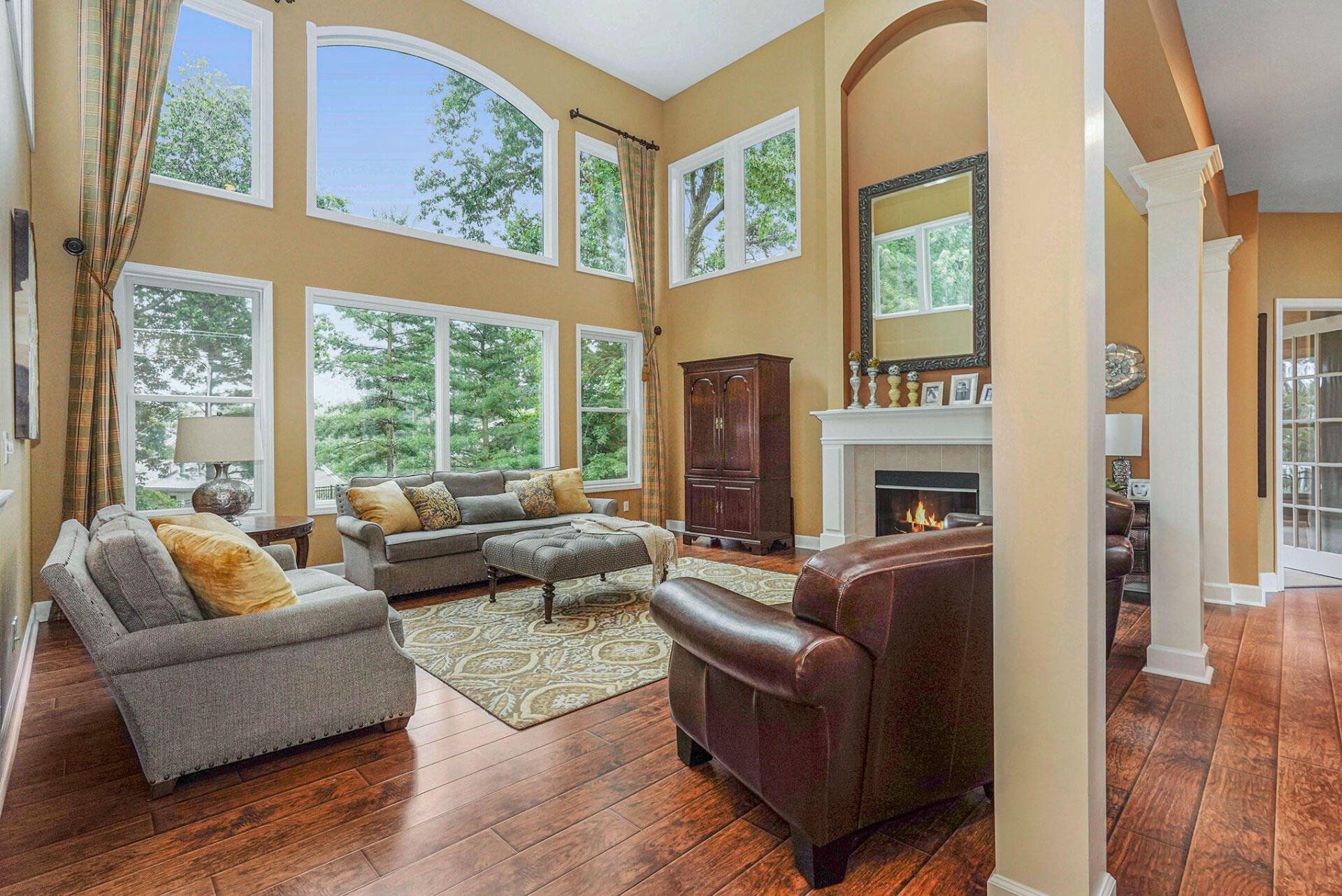 A stunning 2-story great room is perfect for entertainment, recreation, and relaxation wrapped with palatial windows and an inviting fireplace.