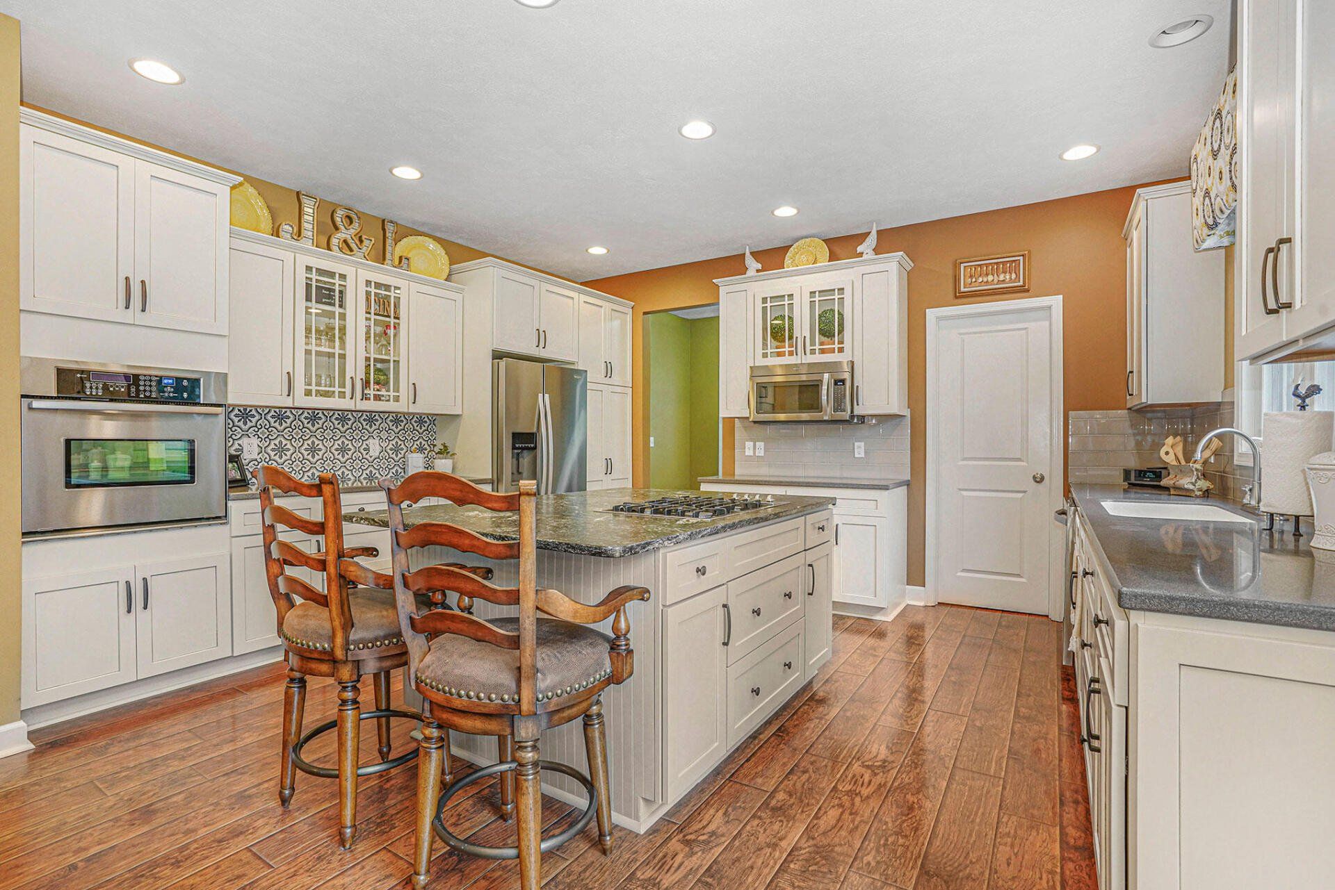 Beautifully appointed kitchen features stainless steel appliances, generous island, rich engineered LVP flooring, custom granite, and solid surface surround, custom splash, large pantry, and convenient laundry-mud room-half bath just around the beyond.
