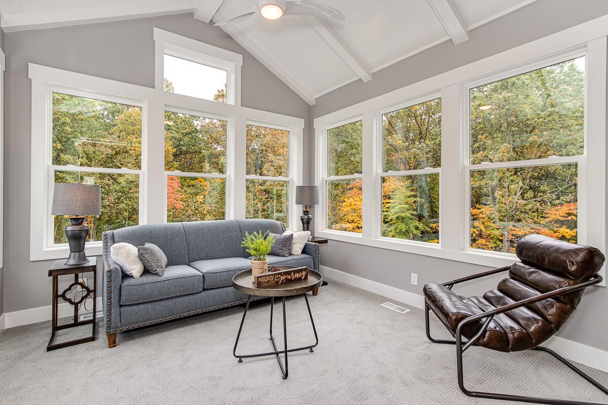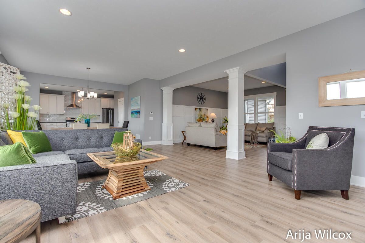 This remarkable home features a gorgeous 2 story palatial foyer, a convenient flex room with retractable barn doors, 9' ceilings on the main level, wrapped in engineered luxury plank flooring throughout the main level, open dining, an expansive great room wrapped a wall of windows wrapped in custom architectural details throughout with exceptional wooded views, custom built-ins, and cozy gas fireplace.