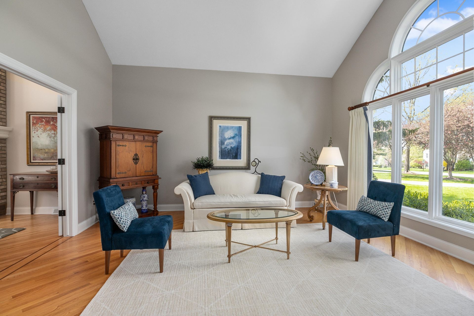 The stunning 2-story great room is perfect for entertainment, recreation, and relaxation wrapped with palatial windows and an inviting wood-burning fireplace.