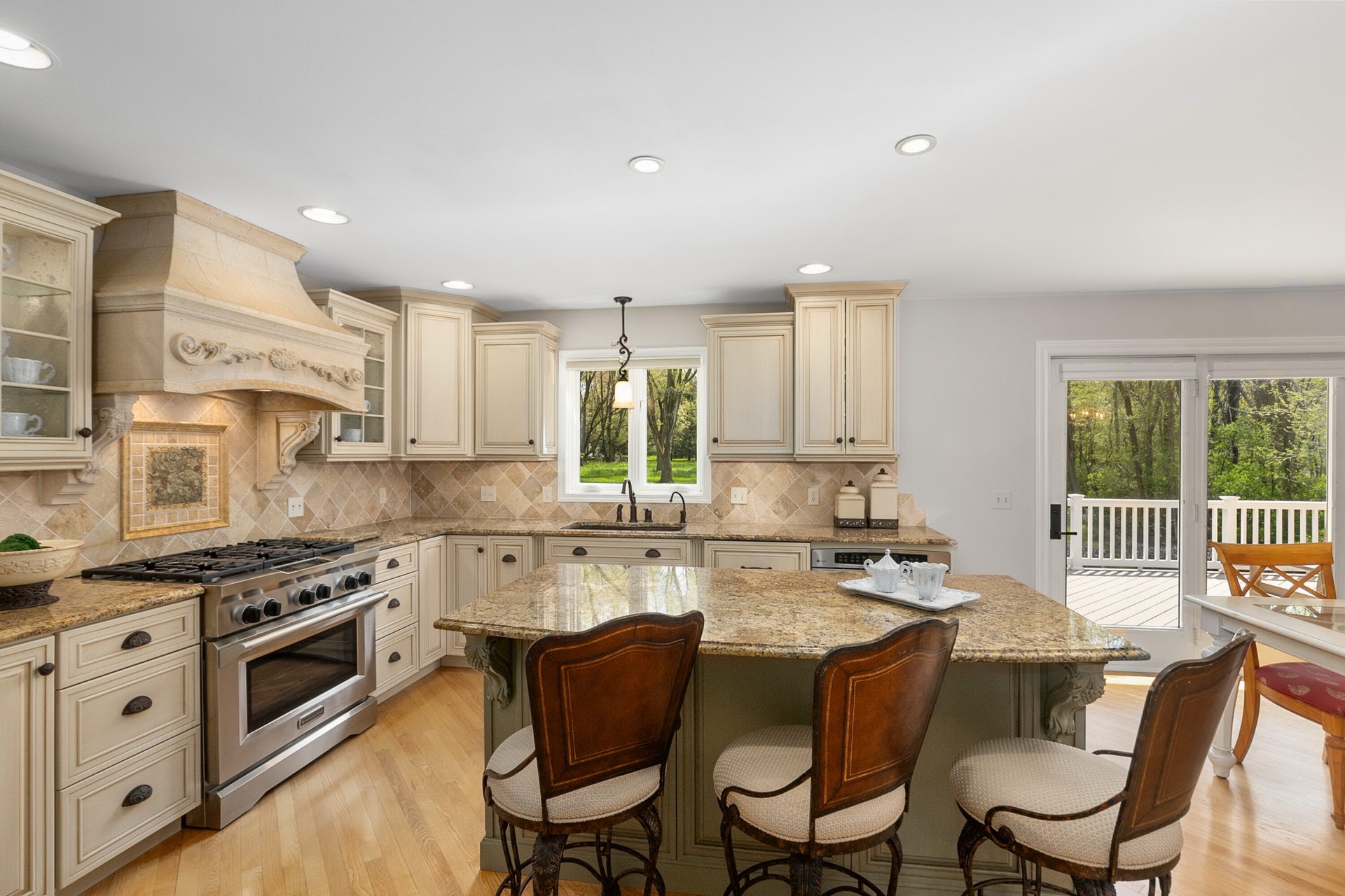 The beautifully appointed chef's kitchen is truly an experience with top-of-the-line stainless and custom-designed appliances including a wine chiller to match the intricate details of the handcrafted cabinetry, generous granite island, rich wood flooring, custom granite & splash surround, relaxed dining that leads to a wonderful deck and stone patio that's a perfect oasis for outdoor entertaining with exceptional park-like views.