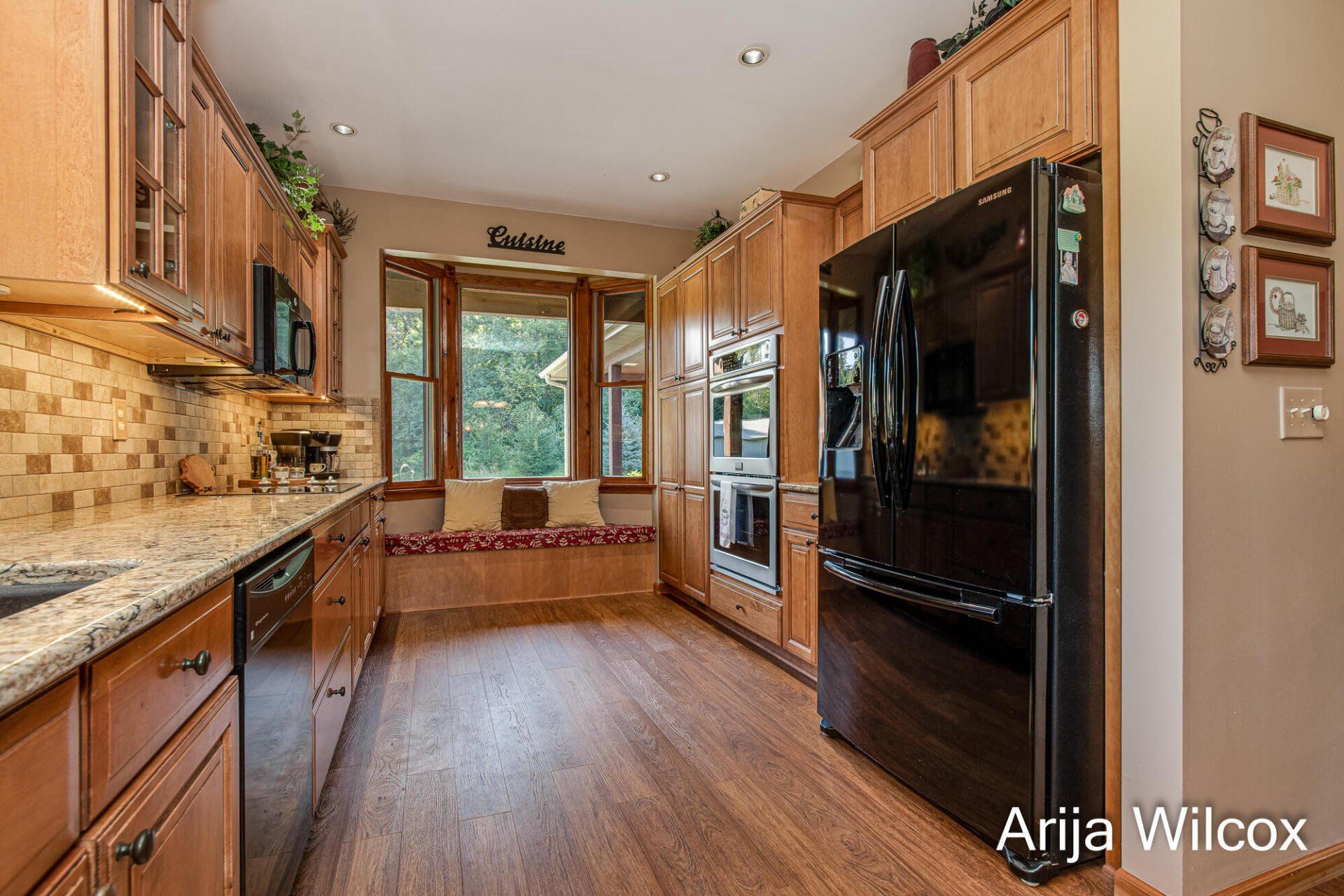 Enjoy making yummy delights in the beautiful kitchen featuring custom-built cabinetry offering loads of storage, quartz counters with tile splash, new LVP flooring, charming window seat, plus elevated serving island open to the gracious eating area that's perfect for large gatherings.